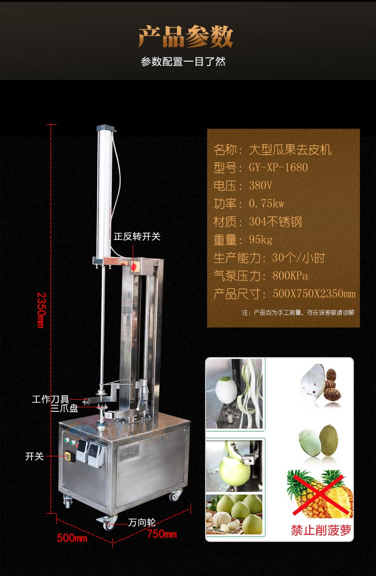 電動不銹鋼大型瓜果去皮機適用于木瓜,南瓜,冬瓜,哈密瓜,柚子等大中型瓜類削皮,削皮厚薄可調(diào)。刀組上下循環(huán)削切效率高,去皮率高達95%以上。削皮刀架特殊設計,可使瓜皮定向排出,方便收集清理。機器拆洗方便,使用時操作簡單,清洗方便,安全衛(wèi)生。去皮機適用于餐飲行業(yè),飯?zhí)茫称芳庸S,冷凍食品廠,休閑食品廠,西餐店設備,飲品店設備,茶餐廳等。防水開關,可調(diào)厚度,鋼質(zhì)刀片耐用不生銹。它是大型工廠、學校、伙房等食堂理想的去皮工具。
